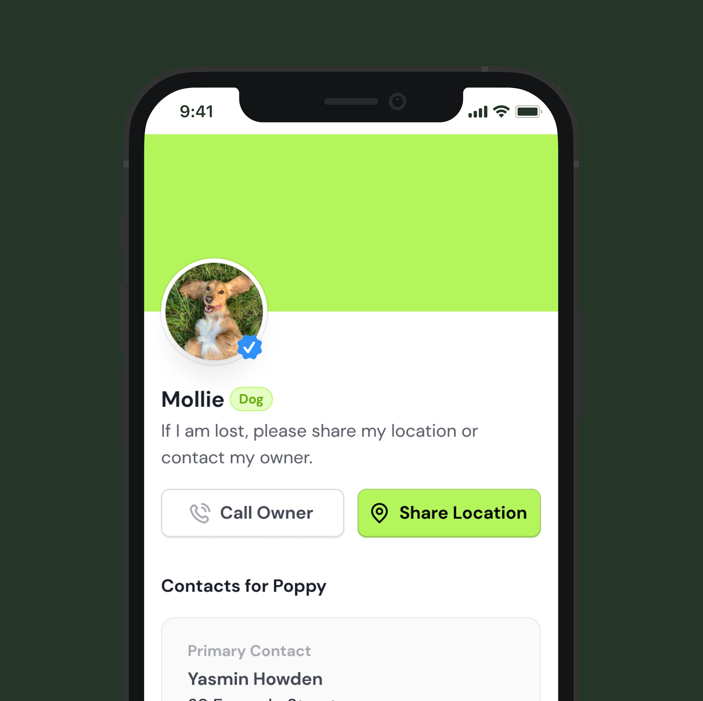 Scan the QR code to create your pet’s profile, add unlimited contacts, and update details anytime.